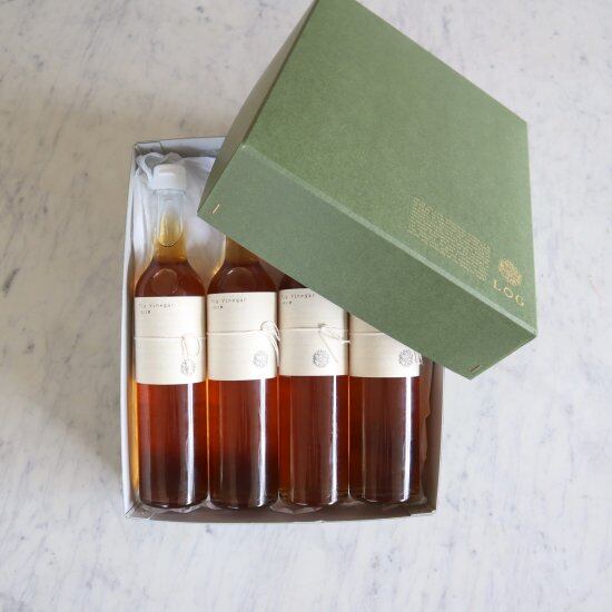LOG SHOPの什器のカラーに合わせたグリーンの箱、真鍮のような金色で箔押しを施しています。贈る方を想像しながら、ご自身で選んだものを詰め合わることが出来ます。